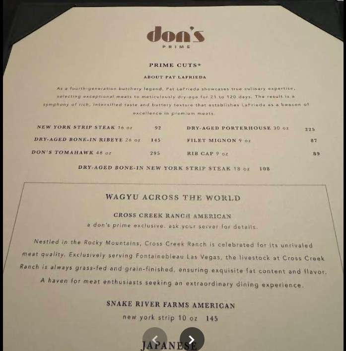 I have been doing reviews for a couple of years now, but this one is really special. From the minute you are welcomed to your exit excellence is the standard. At every, and I mean every step during dinner, your expectations are surpassed. The servers are exceptionally well trained with great personalities. Once your order is determined the food arrives quickly and in every instance hot. The restaurant atmosphere is sophisticated but relaxing with an understated old wold excellence. The Wedge salad is exceptional with a magnificent house dressing and enormous bacon bits. The sole, which is deboned at the table is worthy of a Micheline Star, plus the process is a dying art. The steaks are world class especially the Snake River Farm selections. Then there are the sides, oh my, the Mac n cheese is to die for with the butterkaise cheese and the Potato o Grautan is perfectly crusted. Try the Chocolate Mouse prepared table side for a real winner. Dons Prime is the creme de la creme in Vegas and my #1 Restaurant. Btw its in the magnificent Fontainbleau!